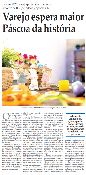 O varejo brasileiro se prepara para o que deve ser a maior Páscoa da história em termos de receita. Segundo projeções da CNC (Confederação Nacional do Comércio de Bens, Serviços e Turismo), o setor deve faturar R$ 3,57 bilhões em vendas para...